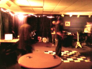 Not everyone was on their feet “juking Jehovah.” Some sat at small tables chatting with friends or working on their laptops, while others lounged on sofas off to the side of the stage. The entire area of the room was somewhat larger than an average living room. While there weren’t enough seats for all of the 20-25 patrons, everyone had room to move around. Occasionally someone would walk in with a slice of pizza or another item purchased from a nearby vendor. I couldn’t spot anyone who appeared to be above the age of 35.