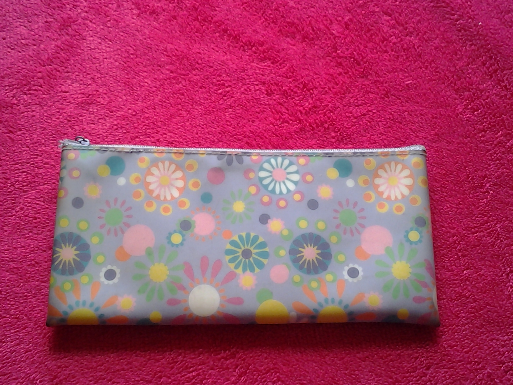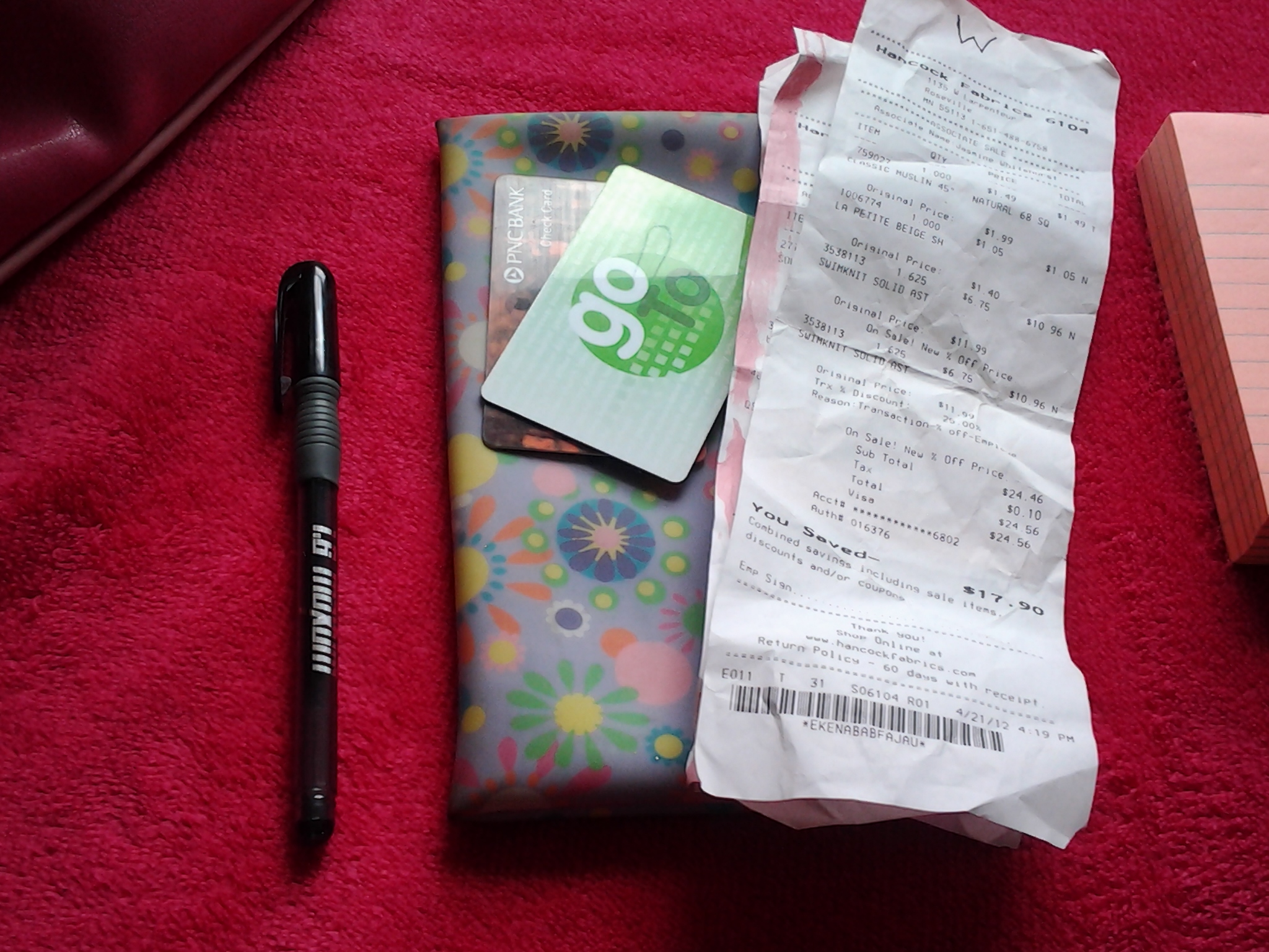 Along with my sewing debit/credit card, I carry my bus pass, a pen, and all of my receipts in this adorable pencil pouch: