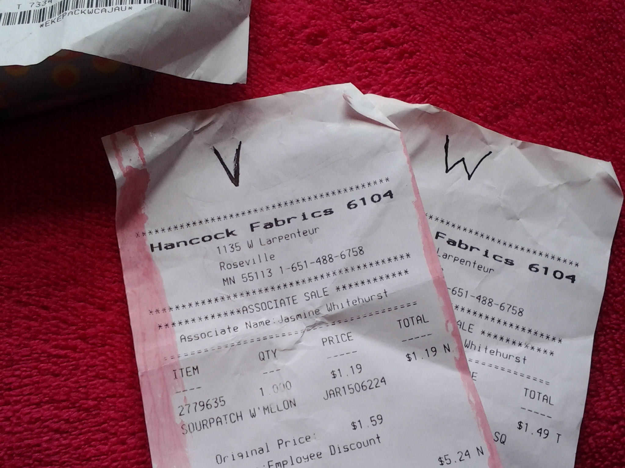 I label all my receipts with an initial that corresponds with the project I’m purchasing for. In this picture the V stands for vest, and the W stands for wedding dress. These are two projects that I’m working on at the moment. This helps me to keep track of how much I’ve spent on each garment so that I know how much it’s worth for selling purposes.