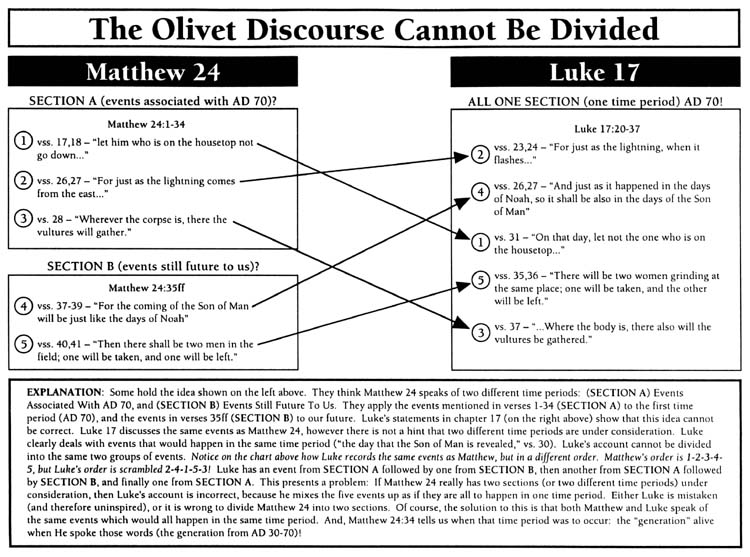 Those who attempt to divide Matthew 24 say that SECTION ONE refers to the events of AD 70. But they say SECTION TWO refers to events yet future to us. If the five prophetic events of Matthew 24 that are found in Luke 17 are numbered 1-2-3-4-5, Luke’s numbering of the same events would be 2-4-1-5-3. Luke has an event from section 1 followed by one from section 2, then another from section 1 followed by section 2, and finally one from section 1. This shows the impossibility of dividing Matthew 24 with a 2,000 year gap.